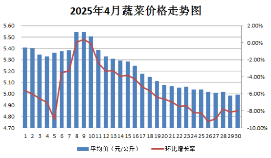 监测的53种蔬菜均价与3月份对比,平均价格为5.23元/公斤,月环比下降 5.42%,21种上涨,18种平稳,14种下跌。月环比涨幅超过5%品种:香菜(+25.88%)、冬瓜(+21.60%)、茄子(+19.63%)、花菜(+15.81%)、菠菜(+12.94%)等;月环比跌幅超过5%的品种:、韭菜(-22.92%)、丝瓜(-31.04%)、黄瓜(-22.94%)、毛豆(-18.31%)、小葱(-17.88%)等。月内高峰值较低峰值落幅为11.24%,月末较月初下降6.70%。造成本月菜价稳中有降的原因:产区转换目前开始进入稳定期,北方设施蔬菜以及南方应季蔬菜集中供应,整体供应环境强劲,外调蔬菜难以对菜价起到提振作用,节前各类蔬菜货源充足,供应平稳,因此菜价并不具备大幅震荡动机。